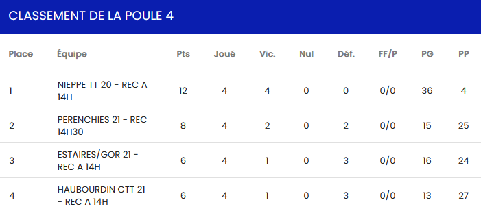 - NIEPPE 4 – Départementale 2 – Poule 3